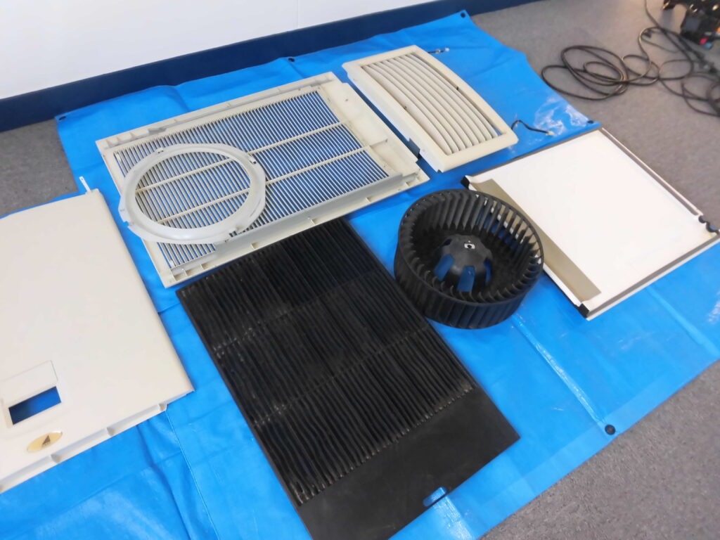 内部のファンや部品を一つひとつ丁寧に分解し、洗浄できる状態に整えます。