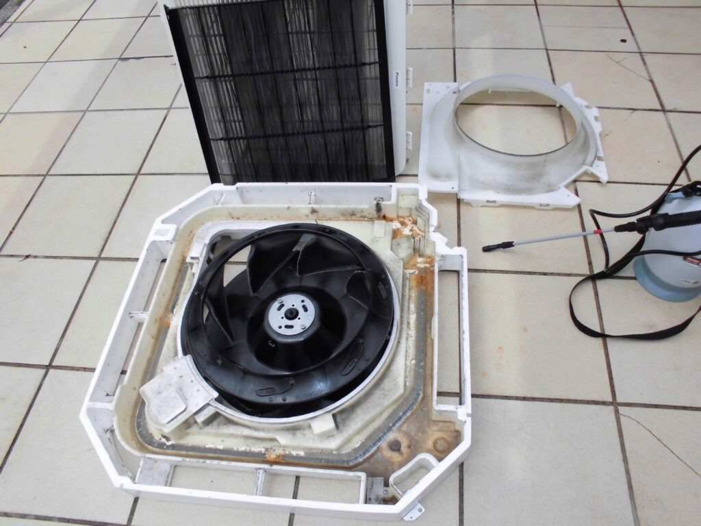 専用機材を用いて熱交換器やファンを徹底的に洗浄した結果、送風量が回復し、
