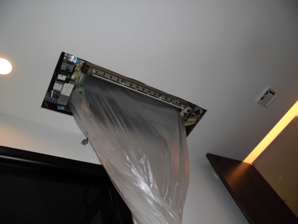 分解したエアコン本体の養生をしっかり行い、周囲を汚さないように準備します。