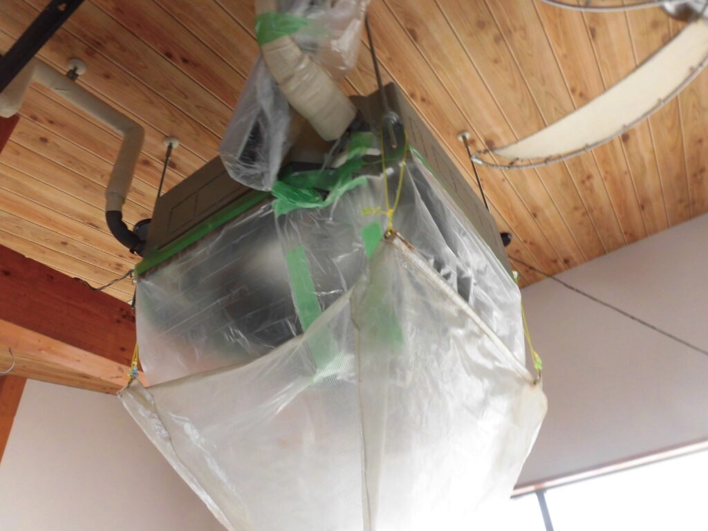 守山市の製造工場で天井カセットエアコンを洗浄。