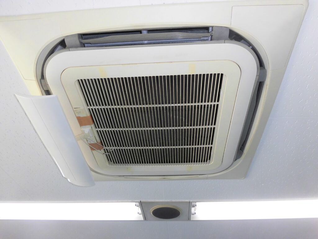 草津市のスポーツジムで天井カセット型エアコンを洗浄。