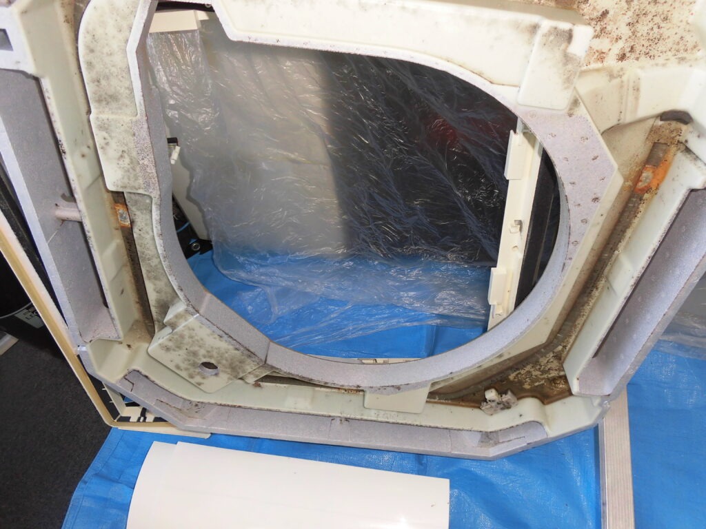 洗浄前のドレンパンにはカビや汚れが付着しています。